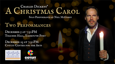 Actor Neil McGarry returns to the Cape with his award-winning, solo performance of Charles Dickens’ A Christmas Carol for two shows this year! Catch him at Thacher Hall on Friday, December 5 at 7:30 PM and at Cotuit Center for the Arts on Tuesday, December 23 at 7:30 PM.